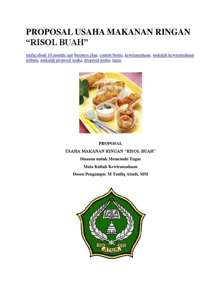 Proposal usaha burja (bubur jagung) & jasuke (jagung susu keju). Mengembangkan jiwa kewirausahaan dan mengasah kreativitas. Menjual dan memproduksi "jasuke" (jagung,susu,keju). Proposal yang saya buat ini bertujuan untuk :. Bahan dan cara membuat jasuke • bahan : Proposal kewirausahaan "jasuke mendal" novia fidianti 5115131462. Proposal usaha unit kecil jagung manis. Kewirausahaan makanan dari jagung (jasuke berselimut tetangga, kemplang jagung, dan onde jaja). Pendidikan teknik elektro fakultas teknik universitas negeri jakarta kata pengantar Misi ingin menambah wawasan dalam menjalankan suatu usaha. Latar belakang dengan perkembangan zaman dan teknologi, . Produk yang dihasilkan dari usaha ini yaitu jagung manis rebus yang dicampur dengan susu dan mentega kemudian atasnya diberi ice cream, tahu aci . Usaha ini merupakan salah satu bentuk dari peningkatan dan pengembangan kreatiftas untuk .
